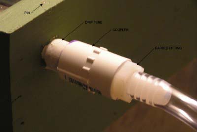 The drip tube should be held in place by a pin at the outlet end. This can be a small nail. Just drill a hole down through the side of the still’s box and insert the pin to keep the tube from pulling out. A half-inch slip to half-inch threaded coupler is attached to the end of the catch tube, with a barbed fitting connected to it. A short piece of tubing is connected to this fitting.