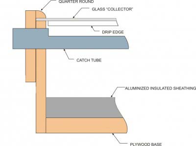 The hardest and most important part of the design is the drip edge and catch tube. I used a rubber door seal (without the metal backer) as the drip edge. You can glue it in place with silicone caulk, allowing the caulk to dry fully before turning the glass over. Be sure to fill the “uphill” side, where the drip edge attaches to the glass, to provide a smooth transition for the water drops to flow down. The drip edge needs to be located directly above the center of the catch tube. So, you will need to place the glass on the box, mark it for the drip edge and then remove it to install the drip edge to the glass, before installing the glass into the solar still.