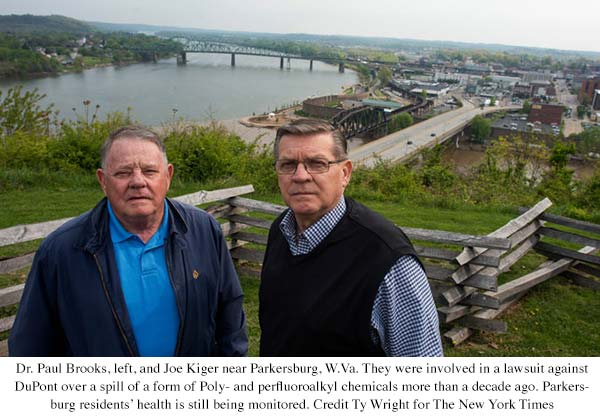 Some researchers cite lingering concerns about a chemical spill more than a decade ago. The health of residents of Parkersburg, W.Va., is still monitored related to a spill of an older form of PFAS from a nearby chemical plant. A class-action lawsuit accused DuPont, which owned the plant, of knowingly contaminating the residents’ groundwater, and the company faces new accusations, in a separate report being issued Friday by the nonprofit Environmental Working Group, that it is not living up to the terms of a court settlement.